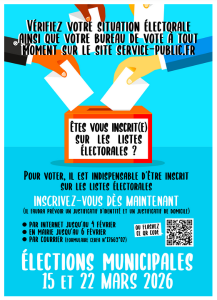 – L’inscription est possible jusqu’à 6 semaines du scrutin. Pour les élections municipales 2026, il sera possible de s’inscrire sur les listes électorales en ligne jusqu’au 4 février 2026 et en mairie jusqu’au 6 février 2026.